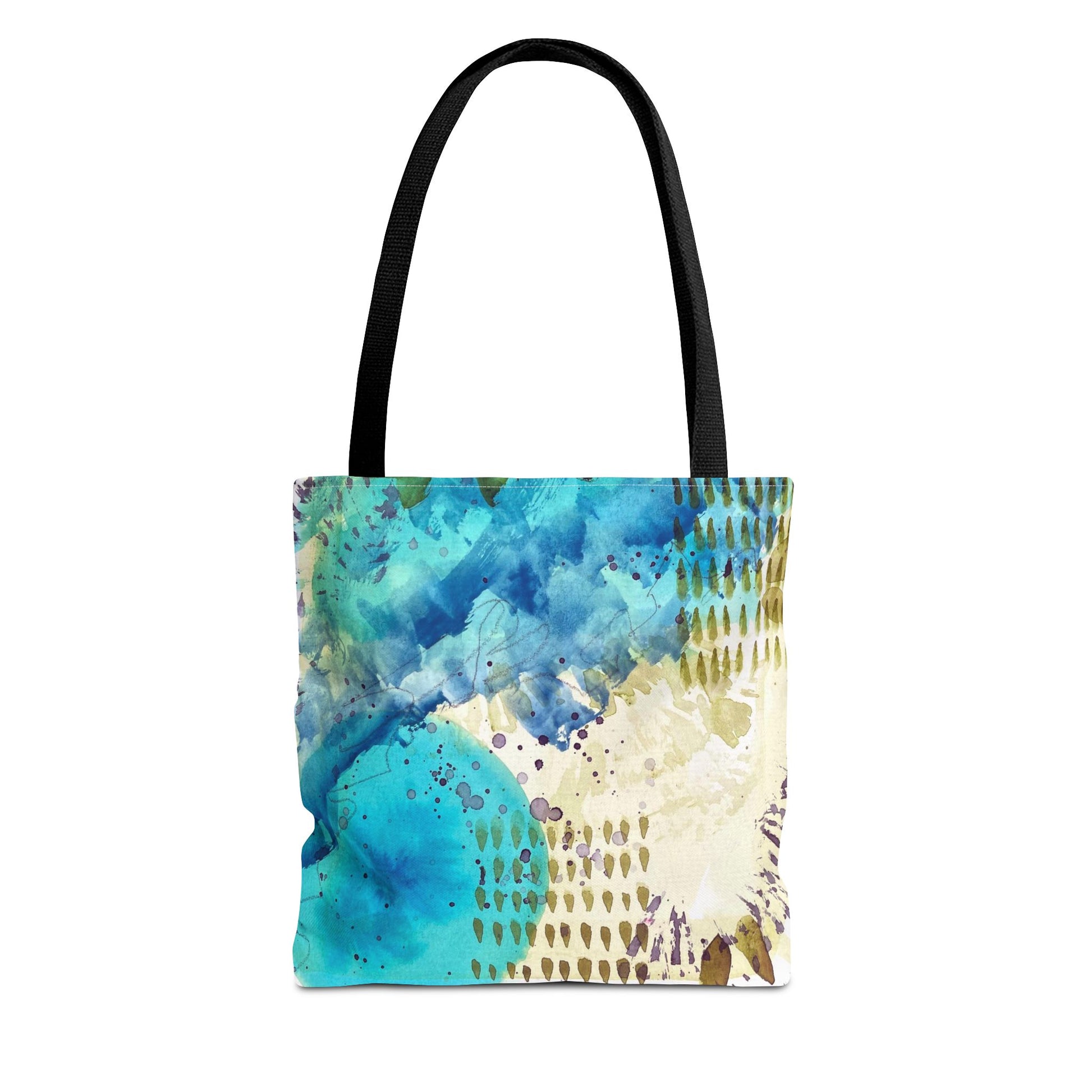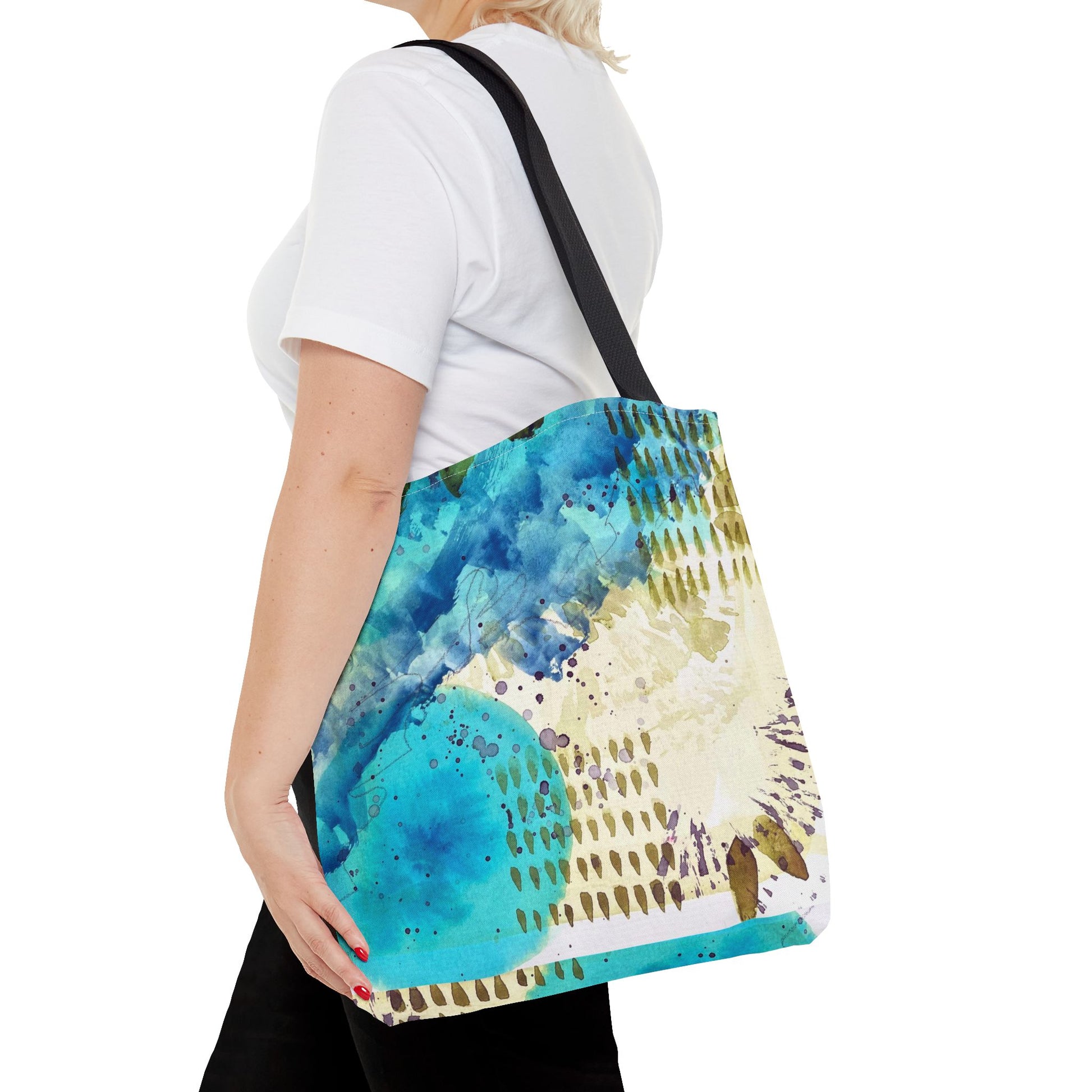 A vibrant, artful tote that feels like carrying a small ocean. Hand-dyed blues, teal washes and soft sand tones flow across the fabric in an abstract watercolor composition, punctuated by subtle gold-like marks for depth. The roomy boxed-corner shape and reinforced handles make it ready for market runs, beach days, or studio visits. Lightweight but sturdy polyester holds its shape and dries quickly, while the soft cotton handles sit comfortably on the shoulder. This tote brings color and calm to everyday life — slip your sketchbook, market finds, or a light sweater inside and go.