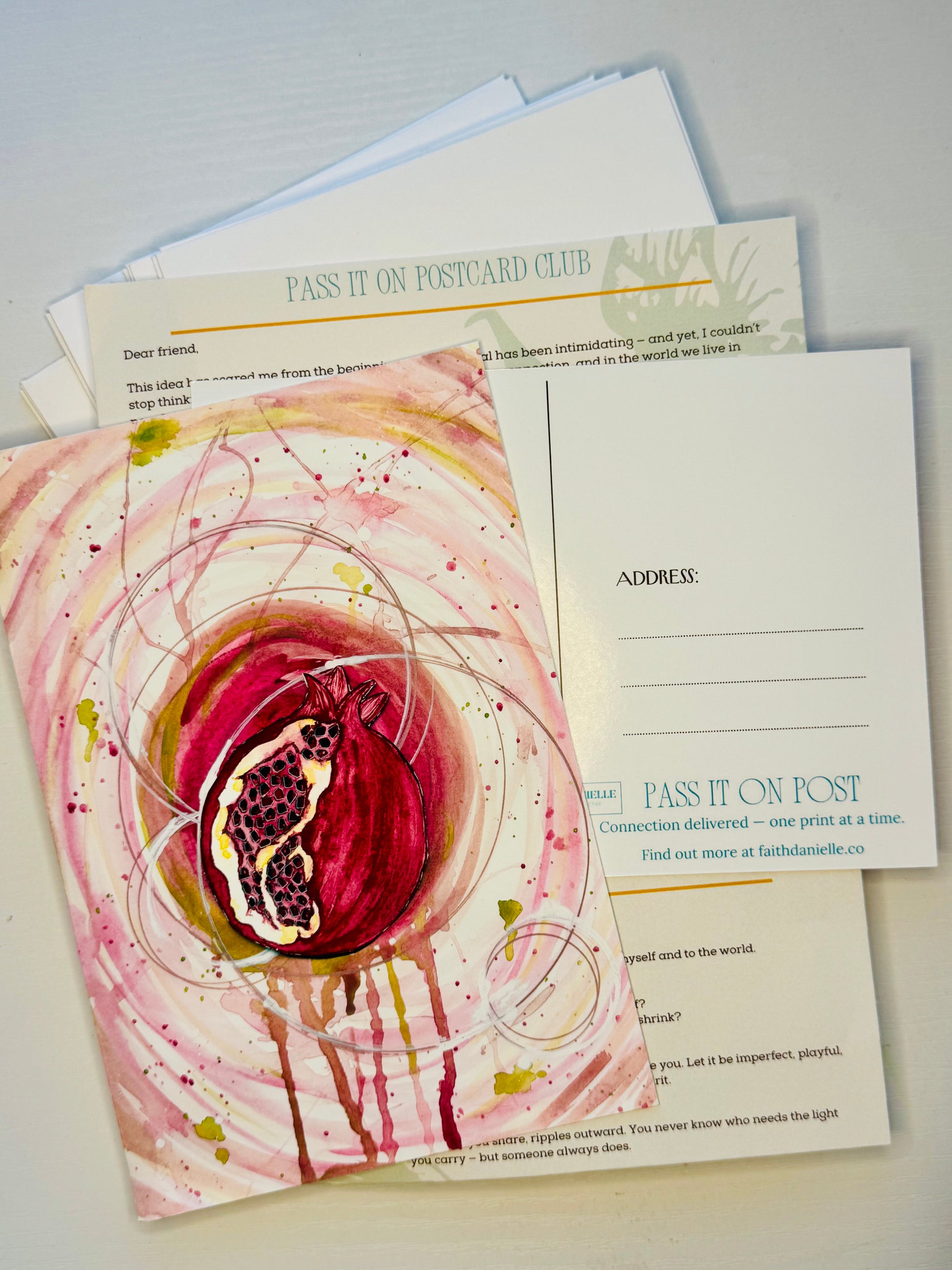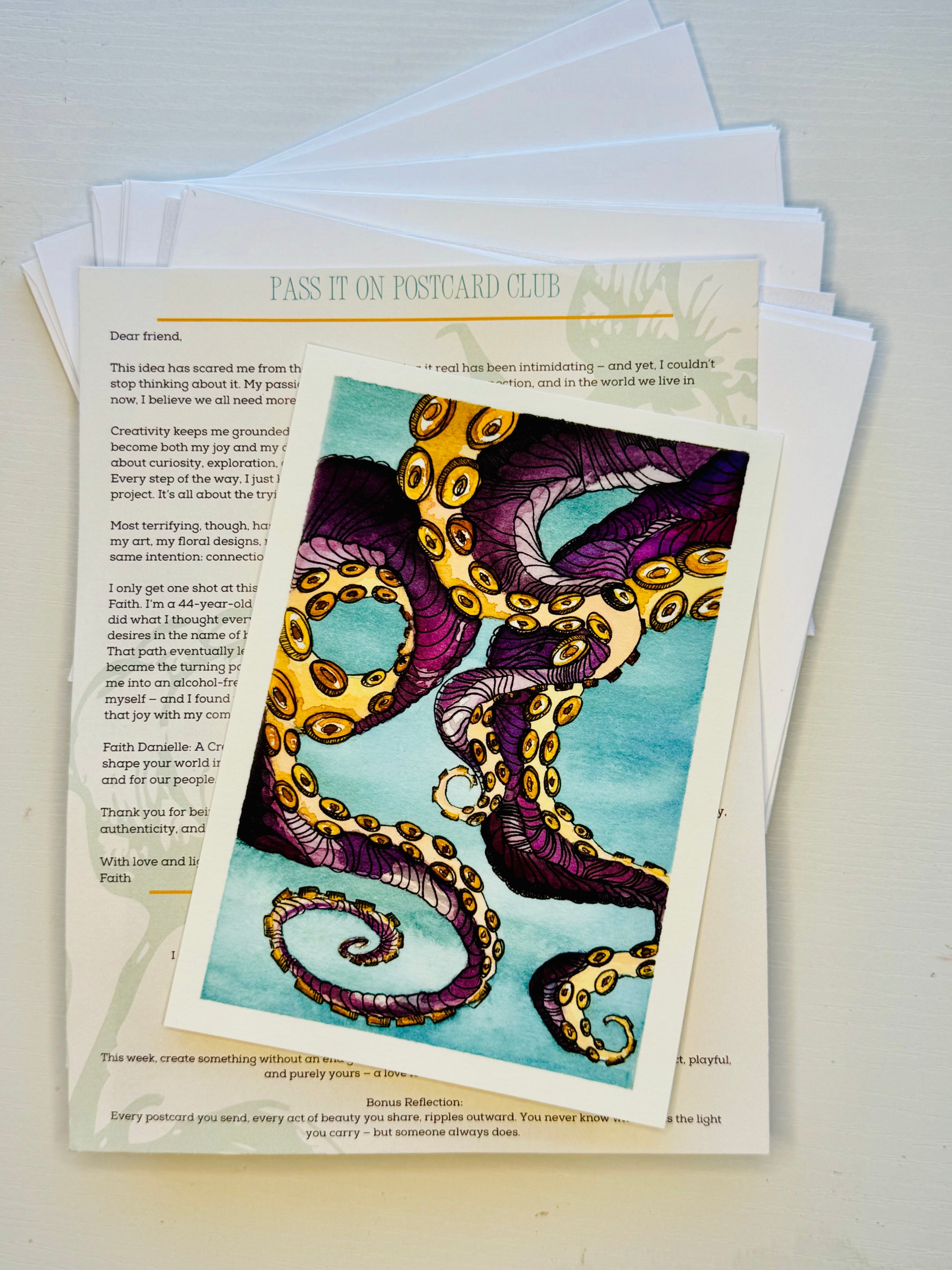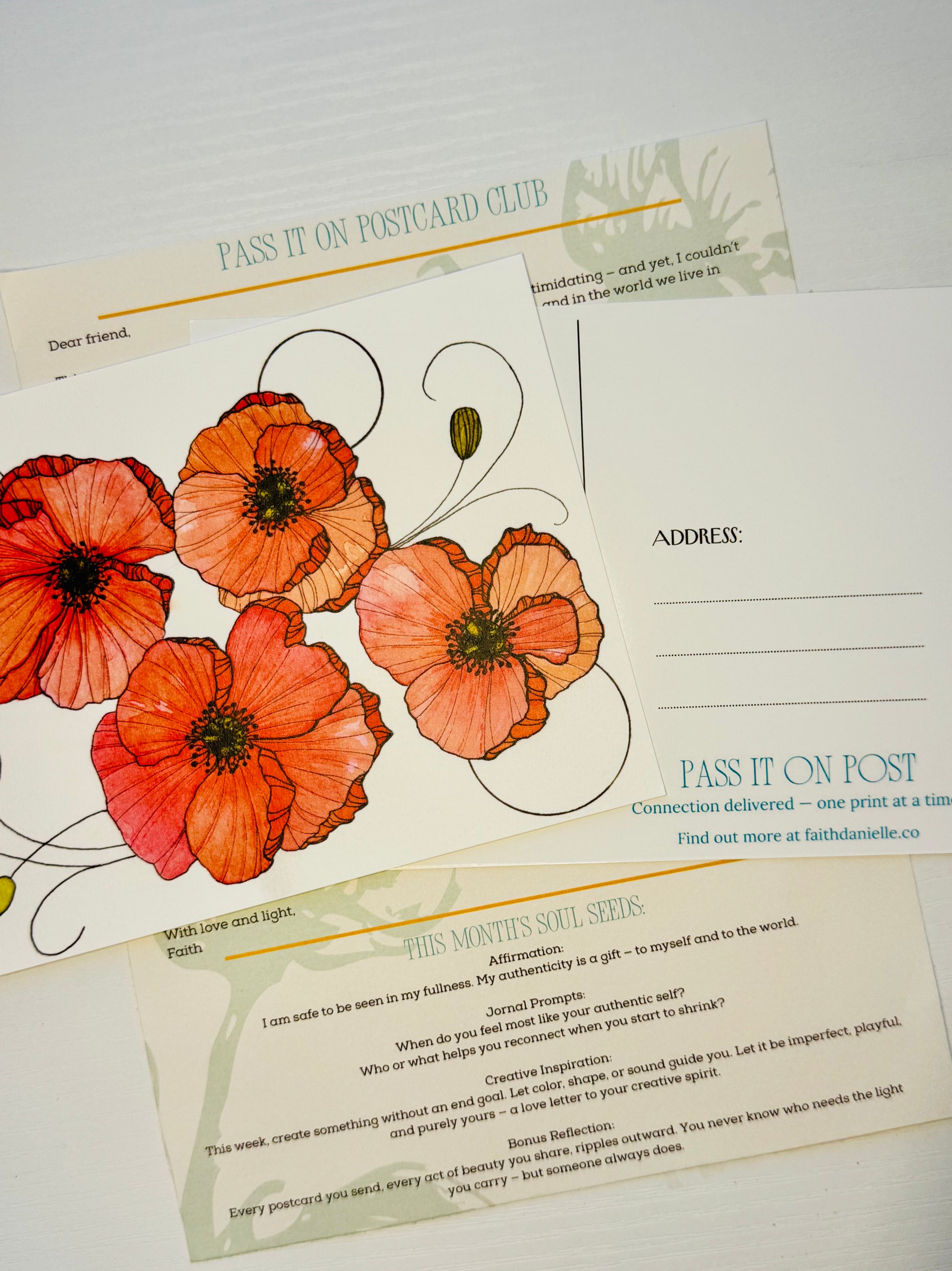 The Pass It On Post Club is a monthly mail subscription celebrating creativity, connection, and joy. Each envelope carries a watercolor print/postcard, a little letter to inspire, and monthly Soul Seeds such as journal prompts, affirmations and inspiration.