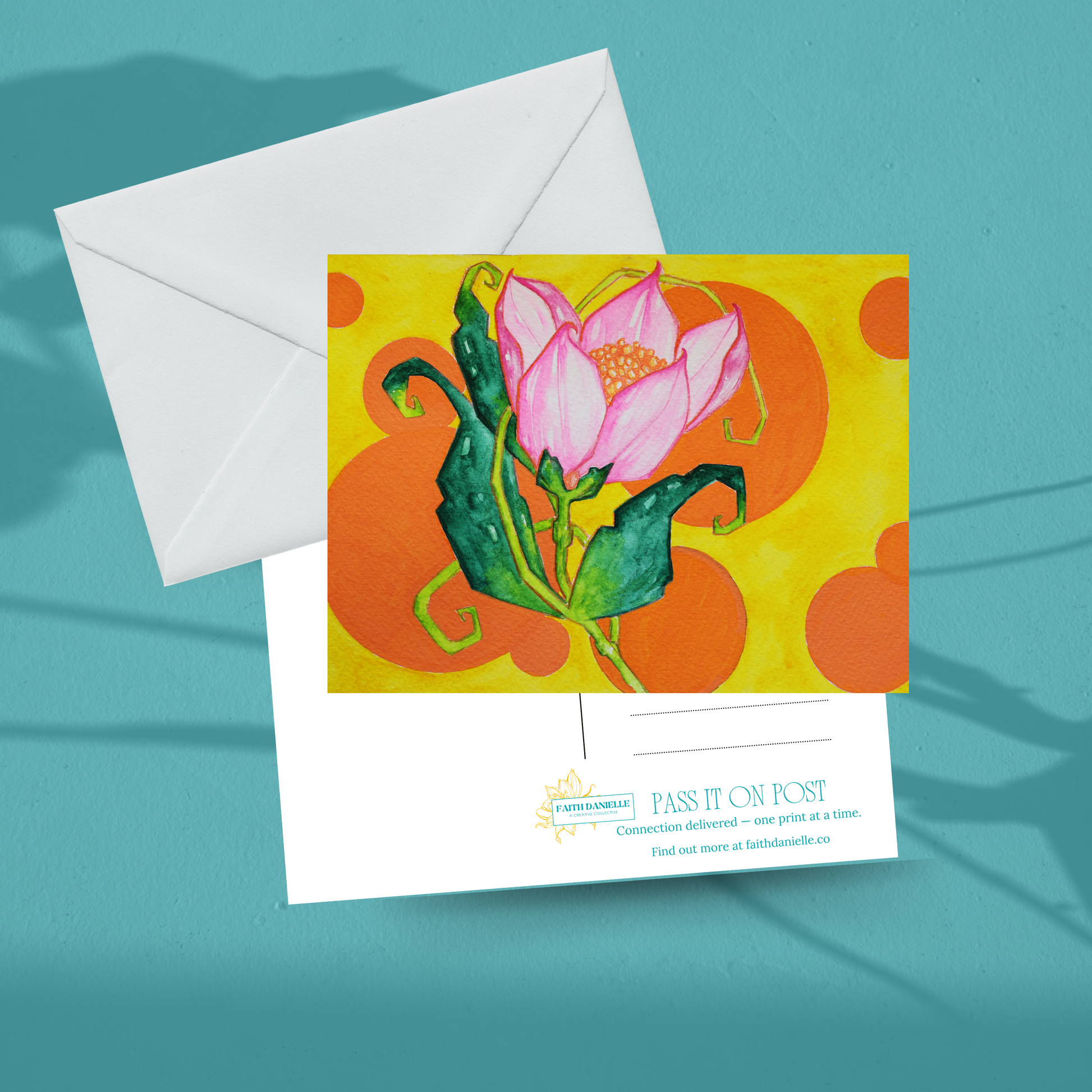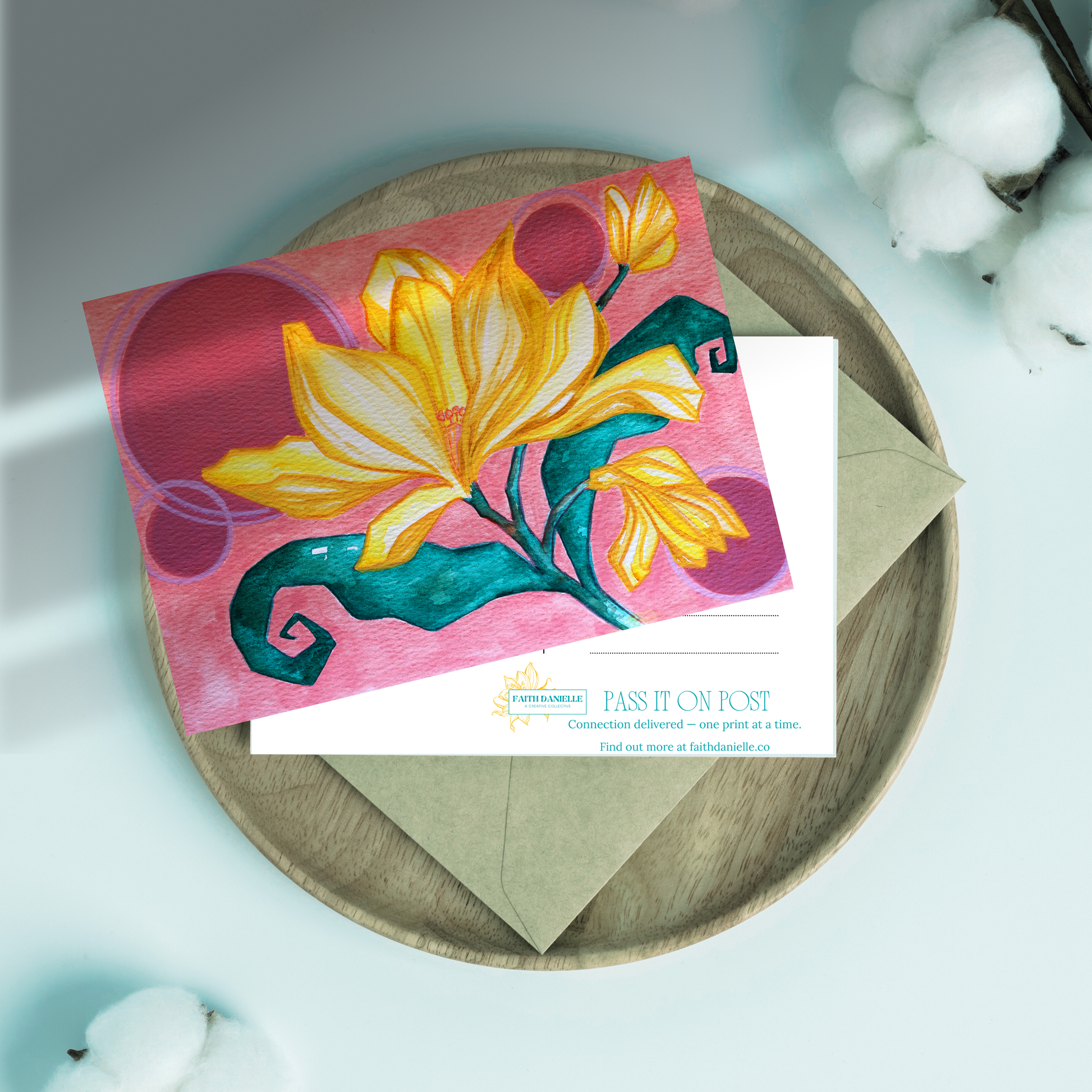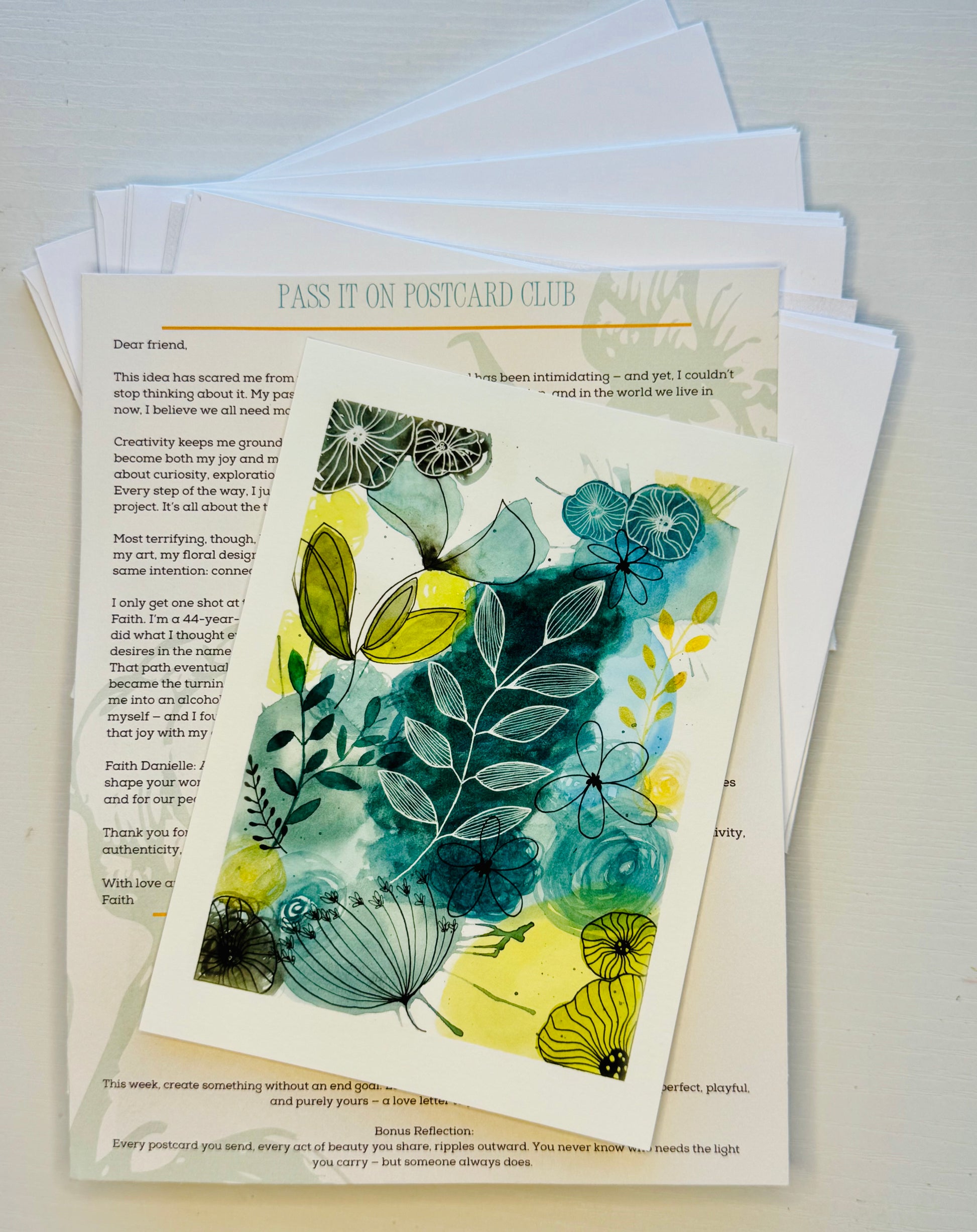 The Pass It On Post Club is a monthly mail subscription celebrating creativity, connection, and joy. Each envelope carries a watercolor print/postcard, a little letter to inspire, and monthly Soul Seeds such as journal prompts, affirmations and inspiration.